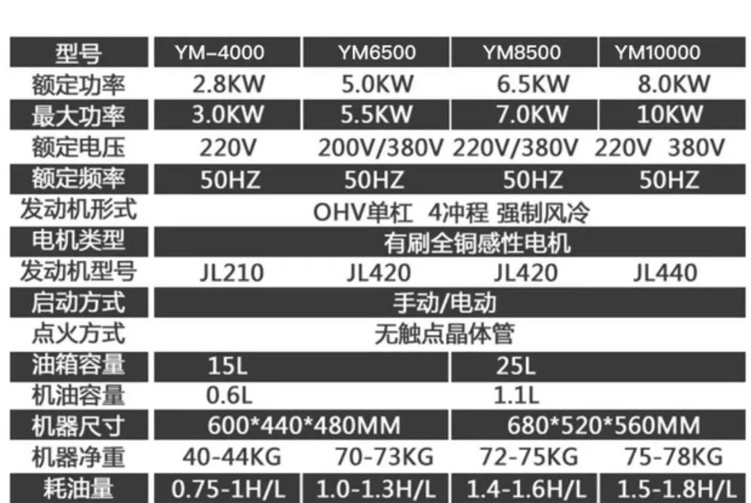知道了充電損耗(20%)后我們在看一下發(fā)電機油耗。發(fā)電機參數(shù)上會有一項燃油消耗參數(shù),耗油量:xxg/kw.h,xx代表不同的數(shù)值,也就是每發(fā)一度電消耗的燃油克數(shù)。國家汽油發(fā)電機油耗的標準是270克/度,也就是在滿載的情況下每小時發(fā)出一千瓦電能需要消耗0.27千克汽油。根據(jù)重量/比重就可以算出升數(shù),0.27/0.722=0.374L??梢钥吹綕M載的情況下汽油發(fā)電機每輸出一度電,需要耗油0.374升。當然數(shù)據(jù)也僅供參考而已,我們看下圖: